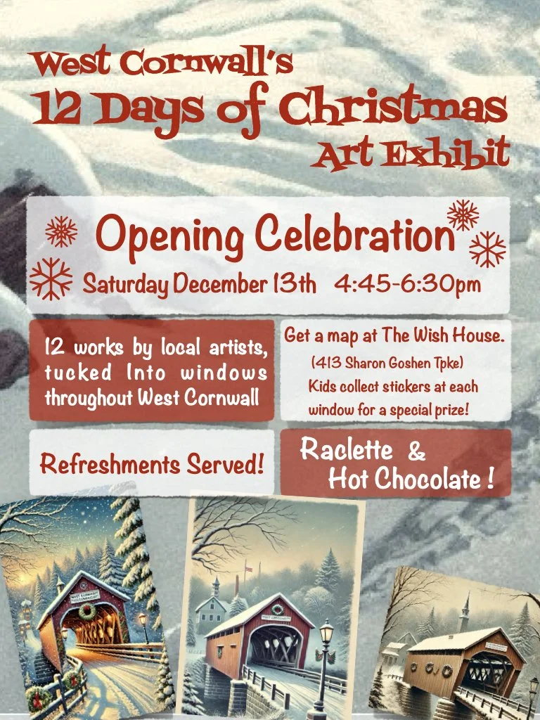 An annual event since 2022, thanks to a dedicated group of local artists and supporters, West Cornwall’s 12 Days of Christmas creates an outdoor gallery celebrating the iconic song and the holiday season in the Litchfield Hills. As you will see on your visit, our artists use the historic rhyme as a launchpad for their own flights of fancy. Join us for the opening celebration on December 13 from 4:45–6:30. First stop in at The Wish House to get your map.